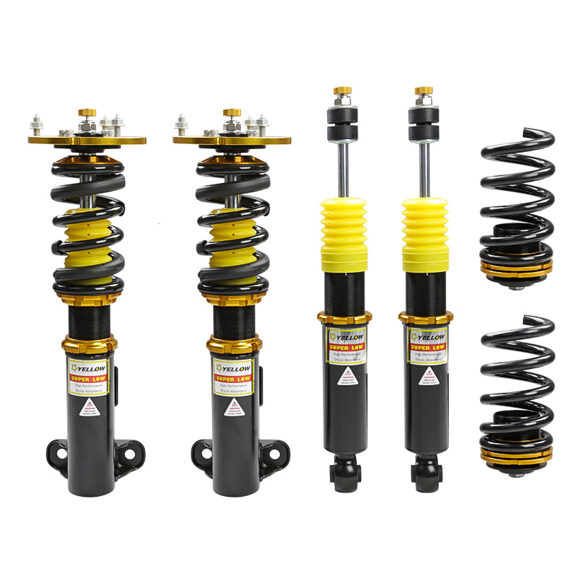 За тези, които искат да подобрят външния вид на колата си чрез значително намаляване, SUPER LOW Version Coilover е комплектът за вас. Този комплект е чудесна алтернатива на въздушното окачване на малка част от цената, като поддържа ниски тези разходи за изграждане. С комплекта Dynamic Pro Sport височината на автомобила може да бъде намалена с 50 mm - 100 mm от фабричната (варира според приложението). Комплектът SUPER LOW Version предлага допълнителни 30 mm спад спрямо комплекта Dynamic Pro Sport. Очаквайте спадане от 80 mm - 130 mm (в зависимост от приложението). Моля, обърнете внимание, че комплектът SUPER LOW ще подобри управлението при возене, но може също така да има отрицателен ефект върху комфорта. От съображения за безопасност превозните средства, оборудвани с този комплект, НЕ се препоръчват да се управляват с висока скорост.